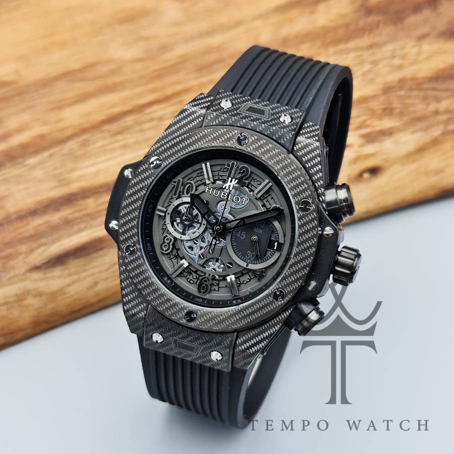 مدل بیگ بنگ از هابلوت که یکی از پر طرفدارترین مدلهای این مجموعه ساعت است دارای قاب استیل خاکستری با طرح فیبر کربن و بند رابر مشکی میباشد. موتور ساعت مچی هابلوت ساخت ژاپن و دارای کورنوگراف و نمایشگر تقویم است.